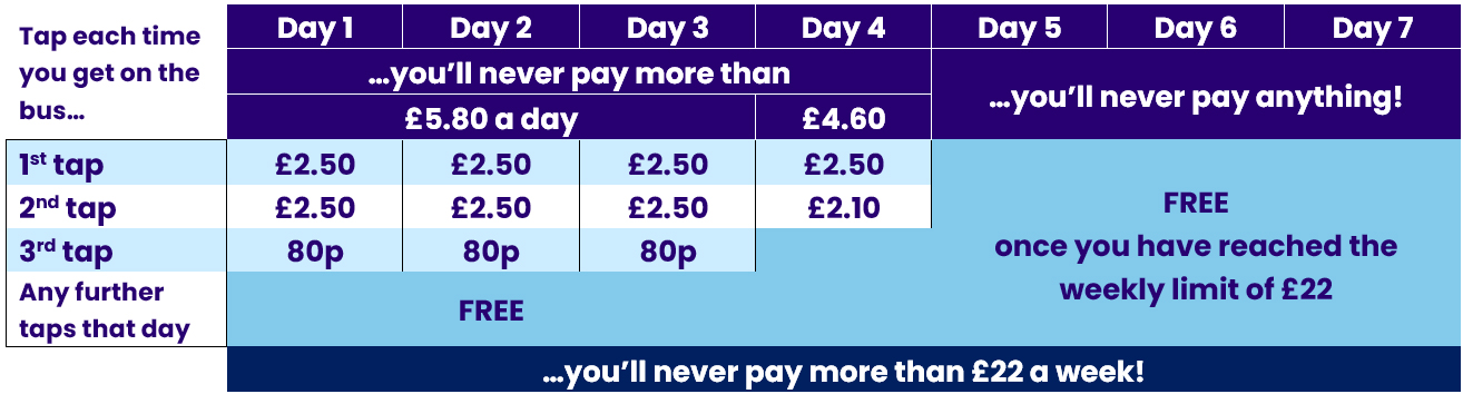 In any week your first three days of travel is limited to £5.80. Day four is capped at £4.60, and any taps for travel days five, six and seven are FREE. The week's travel is capped at £22.00 - renewing each Monday.