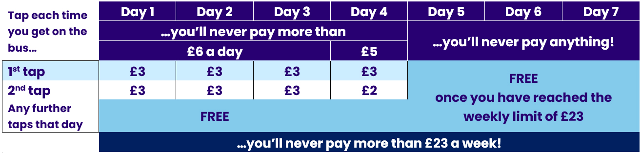 In any week your first three days of travel is limited to £6.00. Day four is limited to £5.00. Any taps for travel days five, six and seven are FREE. The week's travel is capped at £23.00 - renewing each Monday.